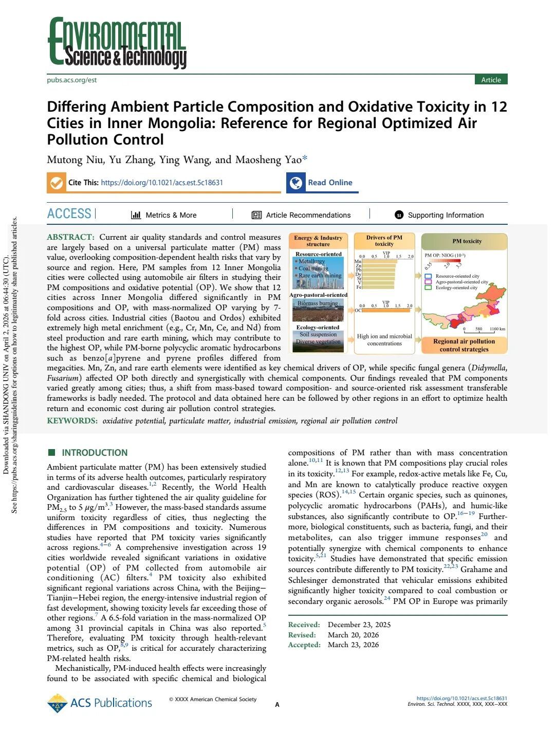 近日,内蒙古师范大学环境健康研究院科研团队在环境科学领域国际顶级期刊Environmental Science & Technology(ES&T)发表研究院成立以来的首篇论文《Differing Ambient Particle Composition and Oxidative Toxicity in 12 Cities in Inner Mongolia: Reference for Regional Optimized Air Pollution Control》。研究系统解析了内蒙古 12 个盟市大气颗粒物的组成差异与毒性特征,为区域差异化大气污染防控提供了重要科学依据。