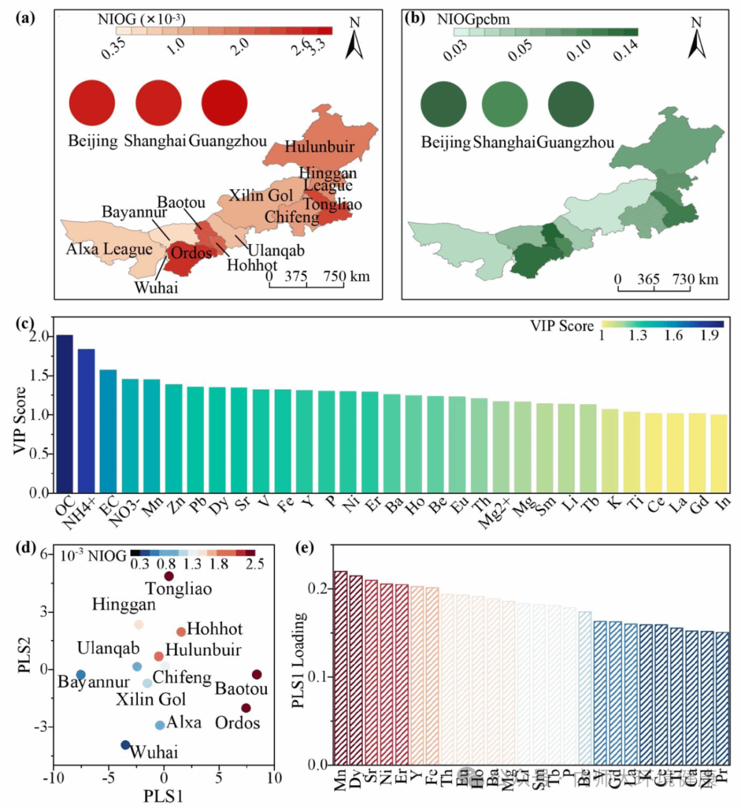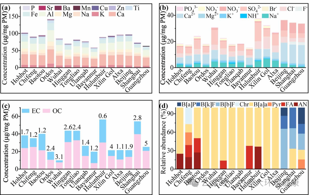 内蒙古作为我国重要的能源基地,各盟市因产业布局差异,大气颗粒物污染源具明显区域特征。内蒙古师范大学环境健康研究院的团队成员牛牧童等通过收集内蒙古自治区12个城市的汽车空气滤芯颗粒物(PM)样品,分析了其化学组分与氧化潜能(OP)。结果表明,12个城市的PM化学组分与OP存在显著差异,经质量归一化的OP在12个城市间差异高达7倍。以钢铁生产和稀土开采为主的工业城市(如包头、鄂尔多斯)表现出极高的金属元素(如Cr、Li、Mn、Ce、Nd)富集,这可能导致了当地PM具有最高的OP;同时,PM携带的多环芳烃(如苯并[a]芘、芘、蒽)成分谱也显著区别于大型城市。研究识别出Mn、Zn和稀土元素是OP的关键化学驱动因子,而特定的真菌属则能直接影响OP,或与化学组分产生协同作用。结果还揭示了PM组分在城市间的巨大差异,因此迫切需要从基于质量浓度的评估框架,转向基于化学组分和污染源导向的、可执行的健康风险评估框架。