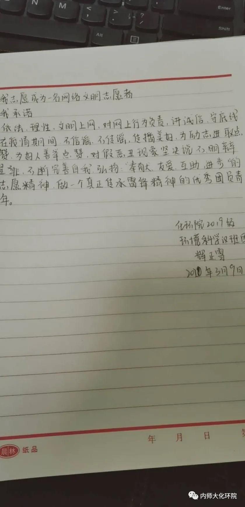 为了抵制在疫情防控期间网络上出现的不良信息,19级环境科学汉班举行了“我承诺,我能行”的活动。活动中,史雨纯、辉正学两位同学晒出了自己的承诺书。通过本次活动,19级环境科学汉班的同学们坚定了与全国人民共同筑牢网上战“疫”防线的信心和决心。