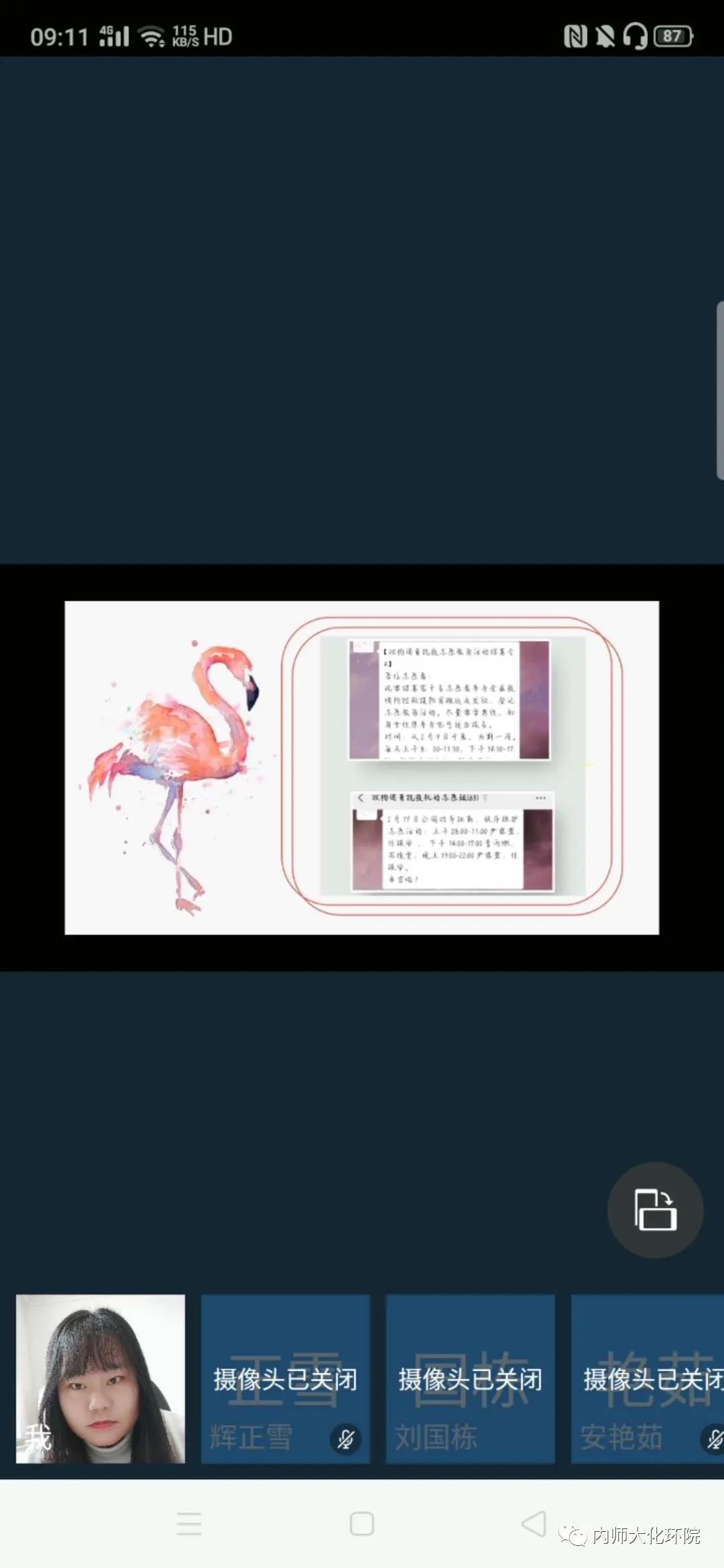 随后,在疫情期间积极参加志愿服务的毕蓉同学以图片和文字的形式和同学们进行了分享。她说,疫情面前,希望每个人都能做好力所能及的事情,争做新时代的新青年。
