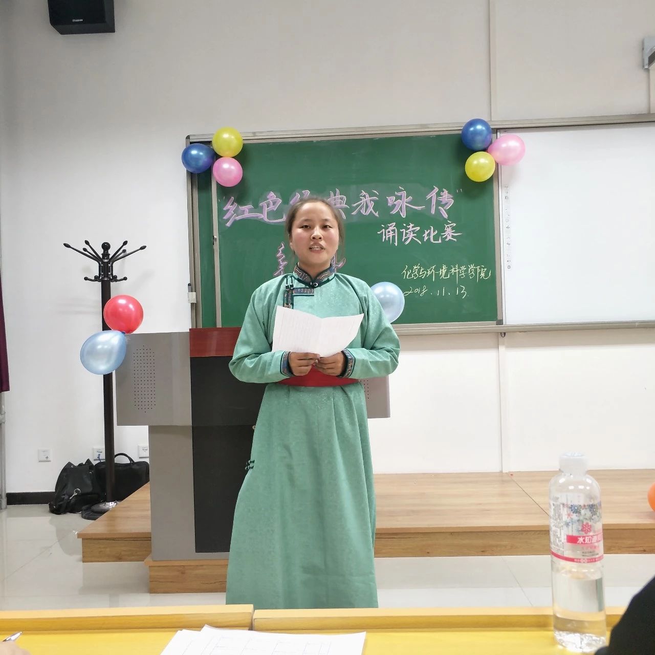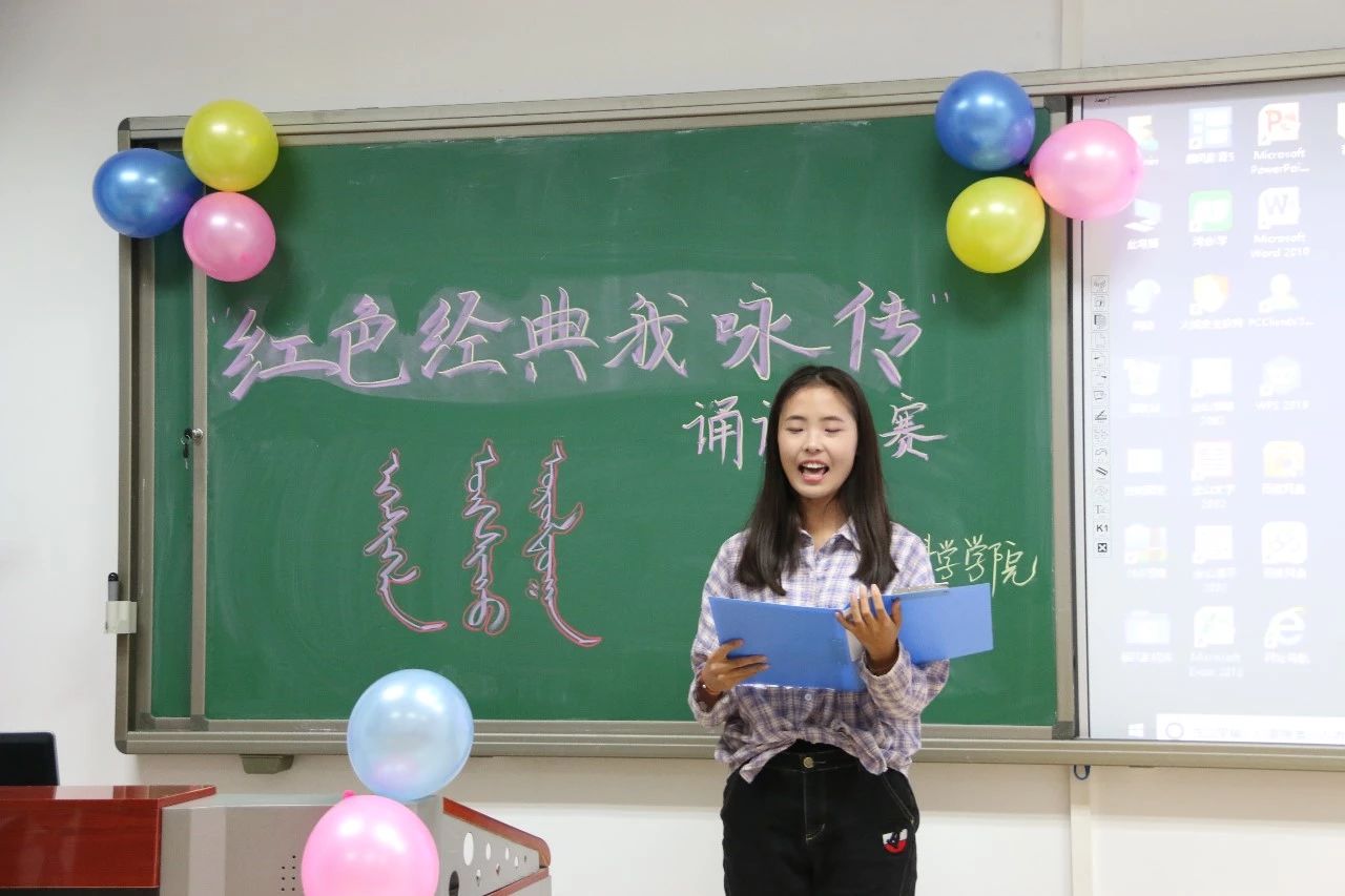 此次比赛由院学生会学习部承办。胡日查老师、何朝鲁门老师、王淑娟老师亲临本次比赛现场。11月13日晚7点,诵读比赛拉开了帷幕。各位选手诵读形式多样,或组合诵读,或个人独诵。其中12号选手王禹尧的一首《红色的十月》,张弛有度,声情并茂,并适当配以音乐,充分展现了诗文朗诵的艺术感染力和舞台表现力。获得了全场如雷鸣般的掌声。随着比赛的进行,比赛也掀起了一层又一层热浪,一波又一波高潮。《我爱你,祖国》、《我爱这土地》、《祖国颂》等诗篇都迎来了观众热烈的掌声。