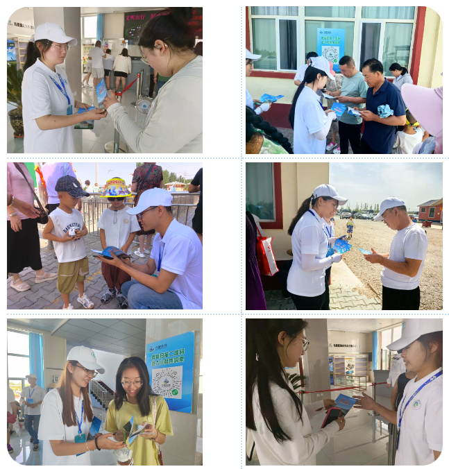学子向游客们发放《黄河“几字湾”生态优先科普进万家》宣传手册,并向周围游客讲解了节水的重要性、黄河流域生态环境现状以及内蒙古黄河河运文旅融合发展等内容,倡导节约用水要从身边的小事做起,增强大家的环保意识和节水意识。同时就生态环境保护方面,向游客们介绍了乌梁素海治理和保护的方向:要用心治理、精心呵护,一以贯之、久久为功,守护好这颗“塞外明珠”。