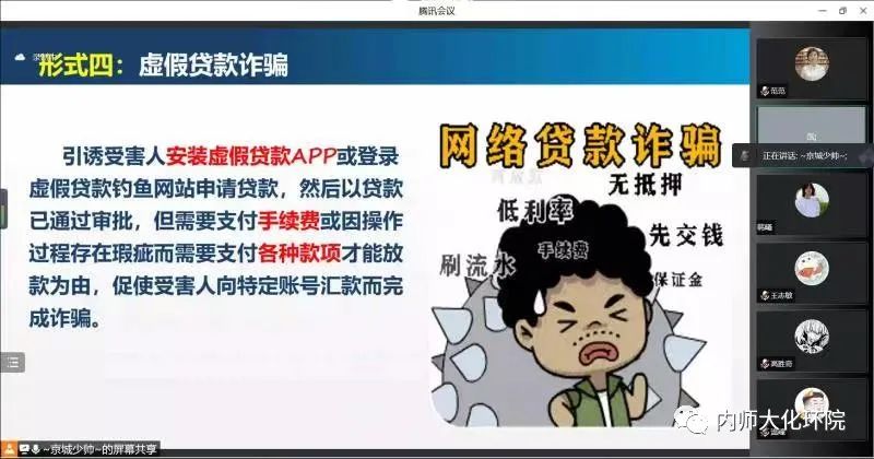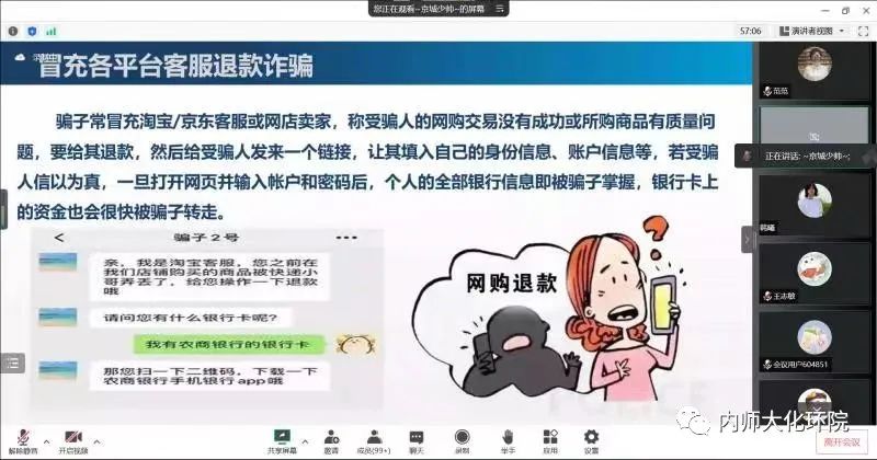 邀请呼和浩特市公安局反诈中心张巍警官在线上为师生进行题为“防范电信网络诈骗-共建平安和谐社会”的反诈骗宣传讲座。院学生工作负责人范磊老师主持了讲座。