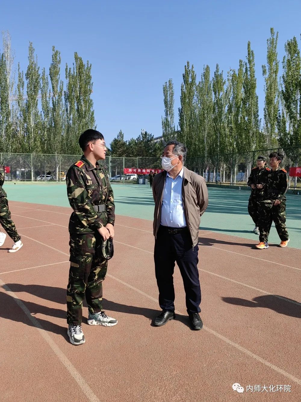 党委书记刘子忠教授来到军训现场,看望参训学生,并亲切慰问辛勤操练的教官们。