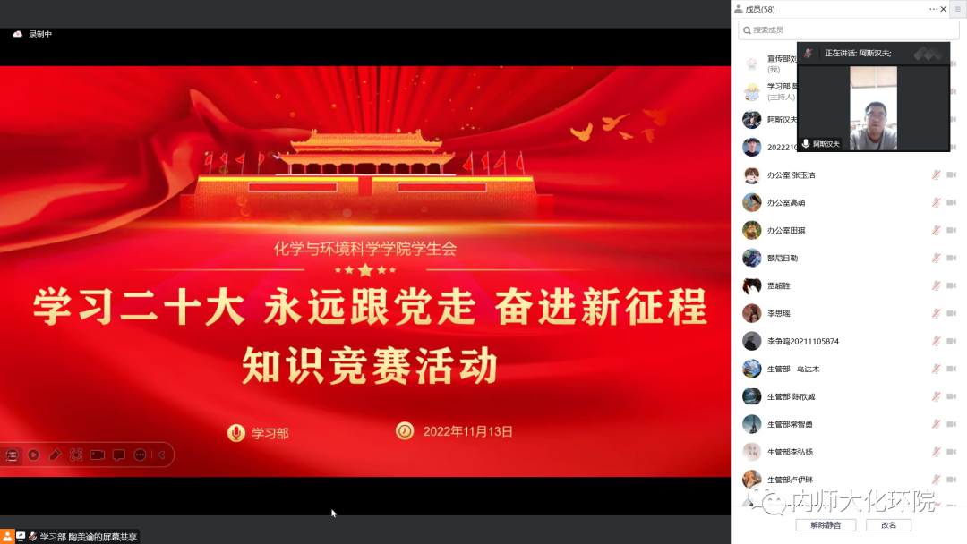 举办了“学习二十大,永远跟党走,奋进新征程”线上知识竞赛抢答活动。此次活动分为两场比赛,下午3点,团总支、党支部、团支部成员进行比赛;晚上7点,学生会成员进行比赛。