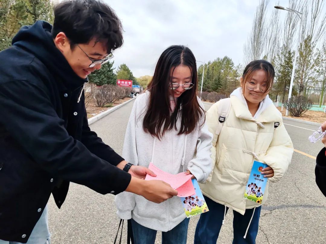 同学们分发有关正确认识宗教的宣传单,开展了签名活动,进一步树立了同学们正确的宗教观念,加深对国家宗教政策法规知识的了解。
