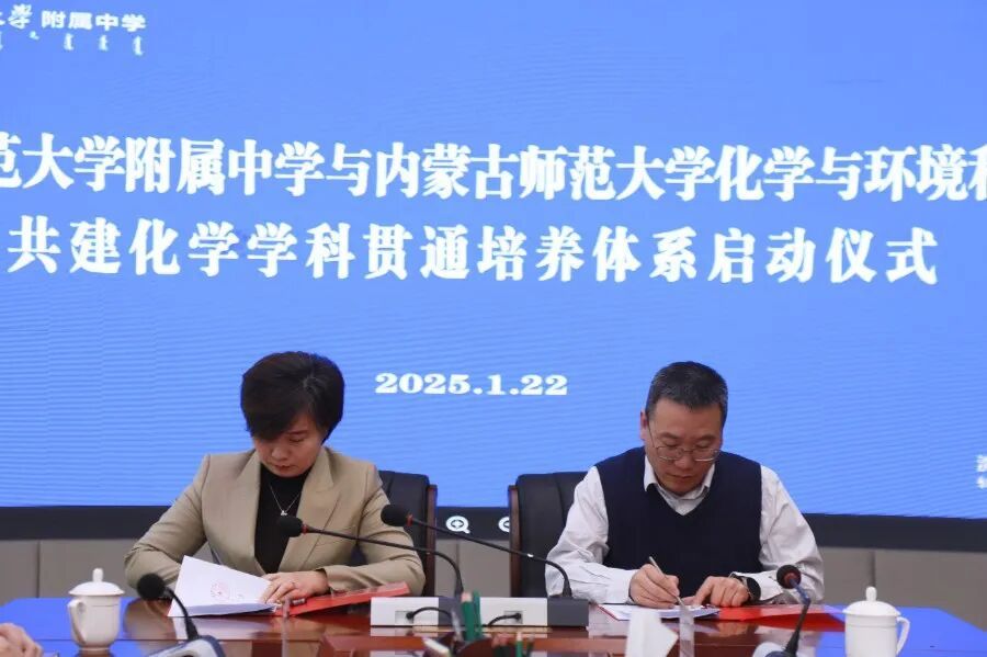 与内蒙古师范大学附属中学共建化学学科贯通培养体系暨师范生实践基地启动仪式在附属中学隆重举行。此次合作标志着高校与中学协同育人迈入新阶段,为化学学科人才培养开辟创新路径。内蒙古师范大学附属中学党委书记萨日娜,校长刘绪才,教师发展与科研中心主任白汇民,化学教研组长王志丹,懂球帝app