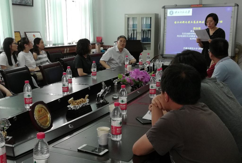贾美林院长主持,内蒙古自治区环境化学重点实验室主任焦燕教授、环境系副主任代钢老师以及其他老师、研究生30余人参加了报告。此次报告主要介绍了基于环境友好高分子材料应用于砂土防流失,并展示了该材料在防水土流失治理的野外试验案例。通过少量高分子材料(例如改性秸秆、改性淀粉等)将沙土包裹固定,可以用作防蒸发渗漏材料、并且可以固定沙土,同时该类材料具有常规环境适应性强、环保无污染、成本低廉等优点,在生态建设中显示了广阔的应用前景。报告会上雷自强教授对广大师生对防砂流失方法与材料合成细节进行详细的解答,解决了老师与同学在科研中遇到的困惑,开阔了大家研究视野。
