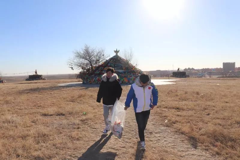 继续进行假期实践活动,在辅导员何朝鲁门老师的带领下,志愿者们前往科右中期敖包。首先志愿者们先按照习俗绕敖包三圈,然后开始清扫周围的垃圾。虽然天气寒冷,但志愿者们丝毫没有松懈,认真做着自己的工作。