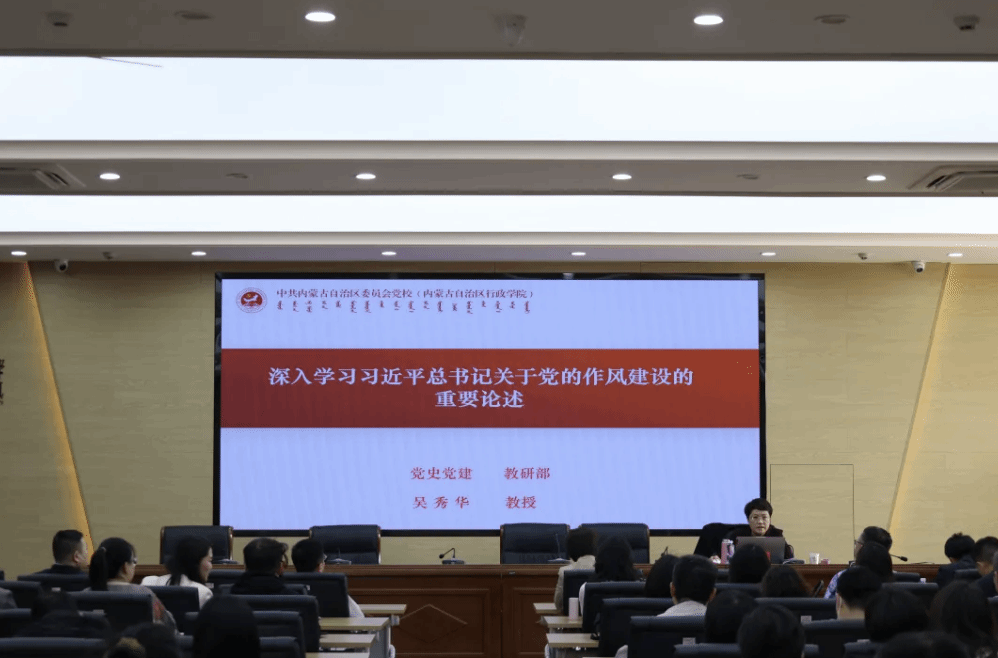 在赛罕校区行政楼三楼报告厅举办深入贯彻中央八项规定精神学习教育读书班专题讲座。讲座邀请内蒙古党校党史党建教研部吴秀华教授作题为“深入学习习近平总书记关于党的作风建设的重要论述”专题讲座。